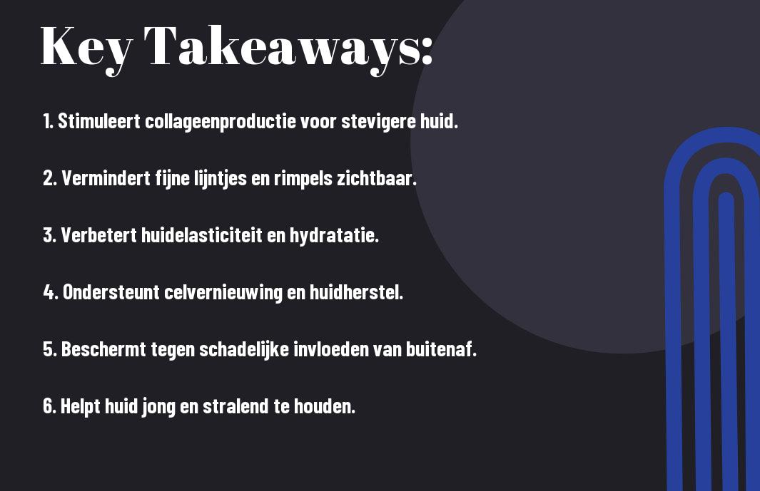 Een adequate hoeveelheid collageen draagt bij aan een goede huidstructuur en bevordert een jeugdige uitstraling. Wanneer uw lichaam voldoende collageen produceert, wordt de huid beter gehydrateerd en zijn de poriën minder zichtbaar. Daarnaast kan collageen u helpen bij het bestrijden van huidproblemen zoals acne of rosacea, omdat het de algehele huidtextuur verbetert. Studies hebben aangetoond dat supplementatie met collageen resulteert in een significante verbetering van huidelasticiteit en hydratatie na slechts enkele weken gebruik. Dit biedt u niet alleen esthetische voordelen, maar kan ook uw zelfvertrouwen een boost geven.