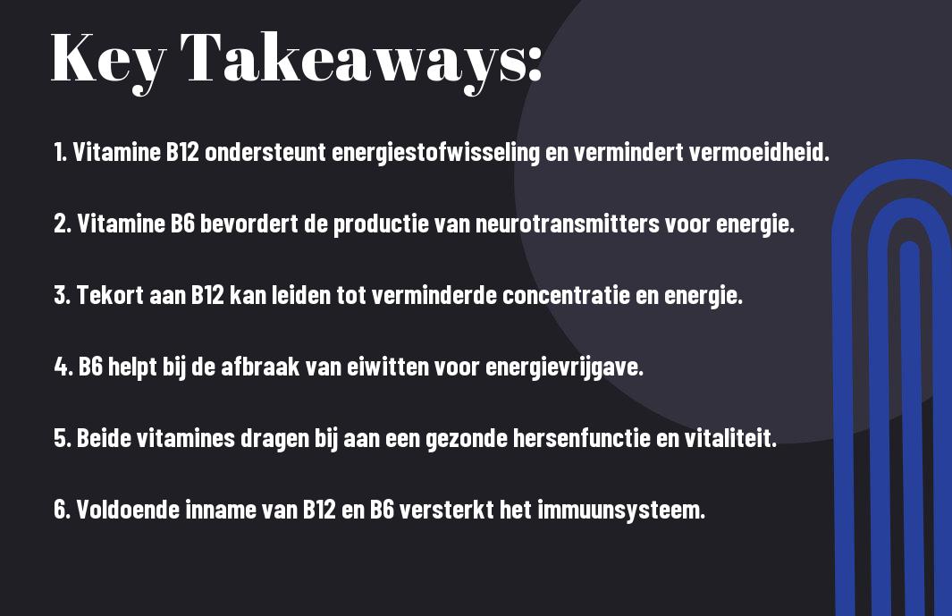 De rol van vitamines B12 en B6 in jouw energieniveaus en algehele vitaliteit kan niet worden onderschat. Beide vitamines zijn cruciaal voor een efficiënte werking van het metabolisme en het zenuwstelsel. Een tekort kan leiden tot symptomen zoals vermoeidheid, concentratieproblemen en zelfs stemmingsstoornissen. Niet alleen helpen deze vitamines om je energiepeil op peil te houden, ze zijn ook essentieel voor de aanmaak van rode bloedcellen, wat betekent dat ze de zuurstoftoevoer naar jouw lichaamsweefsels ondersteunen. Bij een gezond dieet, dat rijk is aan deze vitamines, kun je jouw algehele welzijn en mentale helderheid aanzienlijk verbeteren.
