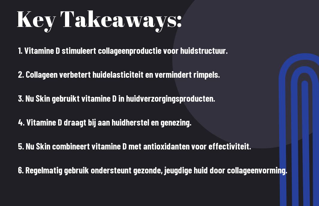 Je kunt je mogelijk afvragen welk verband er bestaat tussen vitamine D en collageenvorming. Vitamine D speelt een fundamentele rol in het bevorderen van collageensynthese. Het stimuleert de fibroblasten, de cellen die verantwoordelijk zijn voor het aanmaken van collageen, zodat deze efficiënt hun werk kunnen doen. Daarnaast heeft vitamine D ook een invloed op de calciumhuishouding in het lichaam, wat essentieel is voor een goede botstructuur. Een gebrek aan vitamine D kan leiden tot een lagere collageenproductie, wat je huidconditie significant kan beïnvloeden. Nu Skin speelt in op deze biologisch actieve stof door producten te ontwikkelen die de natuurlijke collageenvorming ondersteunen, zodat jij het beste uit je huid kunt halen.