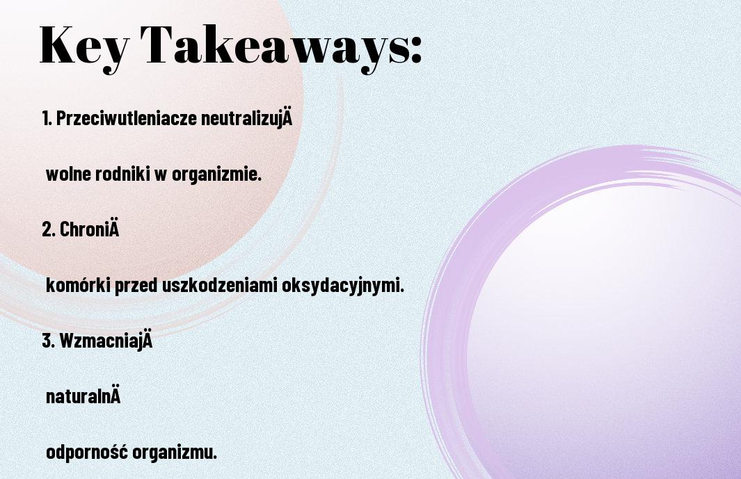 A: Przeciwutleniacze to związki chemiczne, które neutralizują działanie wolnych rodników w organizmie. Wolne rodniki mogą powodować stres oksydacyjny, co prowadzi do uszkodzenia komórek i przyspieszonego starzenia się organizmu. Przeciwutleniacze działają, oddając elektrony wolnym rodnikom, tym samym stabilizując je i minimalizując ich szkodliwy wpływ na zdrowie.