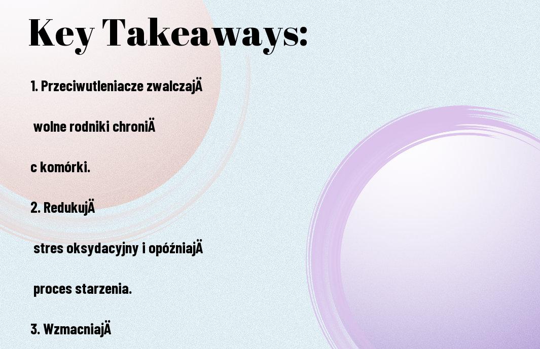 Przeciwutleniacze to związki chemiczne, które chronią komórki przed uszkodzeniem wywołanym przez wolne rodniki. Otrzymujesz je z różnych źródeł, takich jak owoce, warzywa, orzechy czy zielona herbata. Cenne są m.in. witaminy C i E, selen oraz flavonoidy, które przyczyniają się do eliminacji szkodliwych cząsteczek.