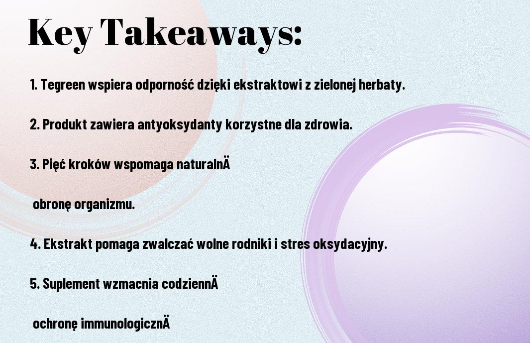 Implementacja pięciu kluczowych kroków w codziennej rutynie pomoże wzmocnić twój układ odpornościowy. Z Tegreen, ekstraktem z zielonej herbaty, możesz skutecznie zadbać o swoje zdrowie. Poznałeś wartość, jaką niesie za sobą naturalna suplementacja, a teraz nadszedł czas, aby zrealizować konkretne działania, które przyniosą wymierne korzyści dla jakości twojego życia.