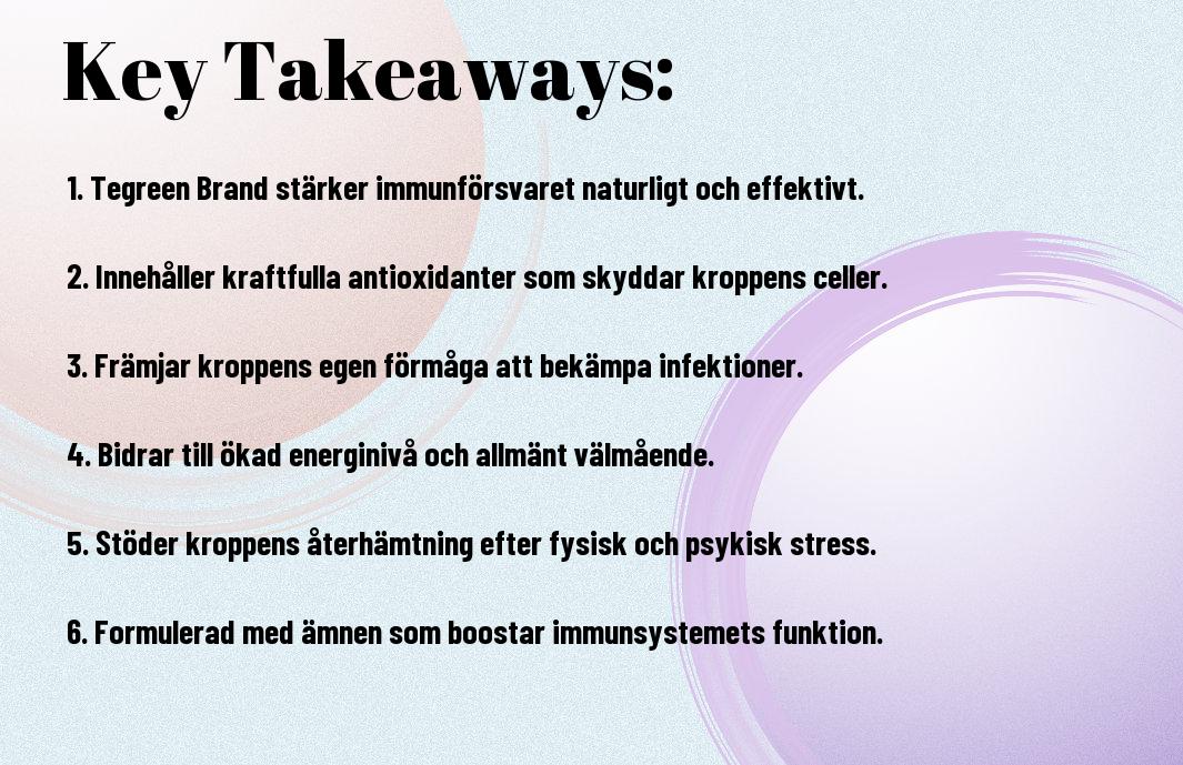 Så, du är nu rustad med kunskapen om hur Tegreen och dess sammansättning bidrar till din immunitet och övergripande hälsa. Kom ihåg att varje glas som du sörplar ger dig inte bara de där kraftfulla antioxidanterna utan också en smidig väg för dig att boosta din kropp. Resan mot ett starkare immunförsvar kräver engagemang, men med Tegreen vid din sida är du redo att ta dig an varje utmaning. Släpp loss din inre energi och låt din kropp glänsa – för din hälsa ska alltid vara #1!